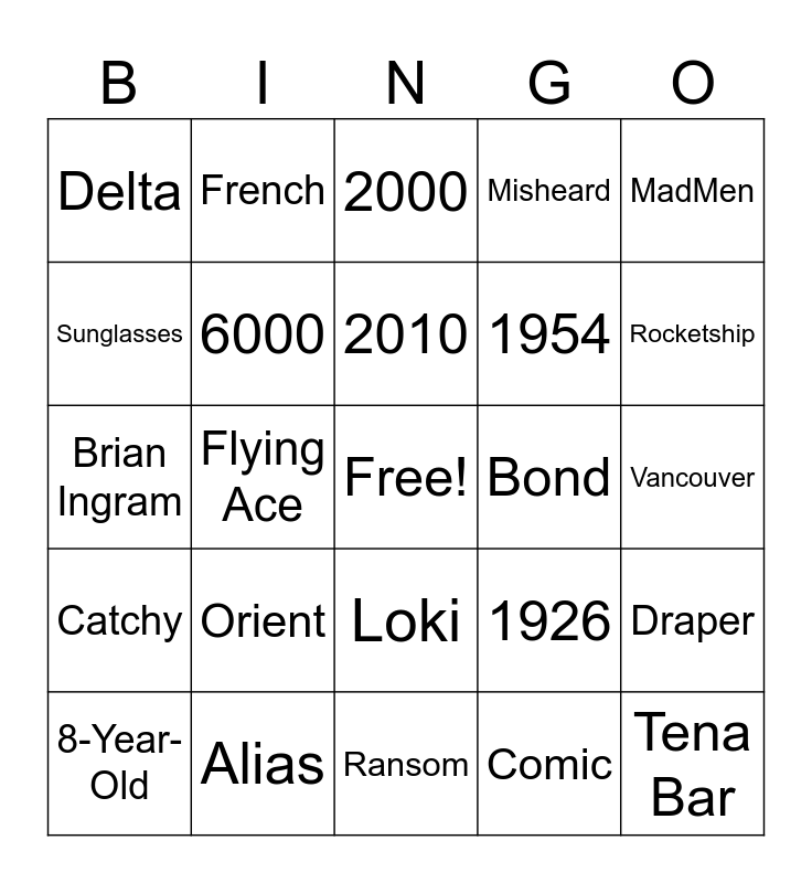 This bingo card has a free space and 24 words: Orient, Alias, 2010, 8-Year-Old, MadMen, Delta, Sunglasses, French, Bond, Loki, 1954, Brian Ingram, 1926, Draper, 6000, Comic, Vancouver, 2000, Rocketship, Flying Ace, Tena Bar, Catchy, Misheard and Ransom.