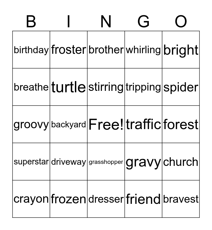This bingo card has a free space and 36 words: march, cracker, forty, turtle, gravy, superstar, stirring, harbor, bright, present, backyard, whirling, cricket, traffic, spider, birthday, nurse, driveway, bravest, brother, forest, church, frozen, crayon, dresser, froster, groovy, pretty, tripping, breathe, crown, dragon, friend, grasshopper, princess and triangle.
