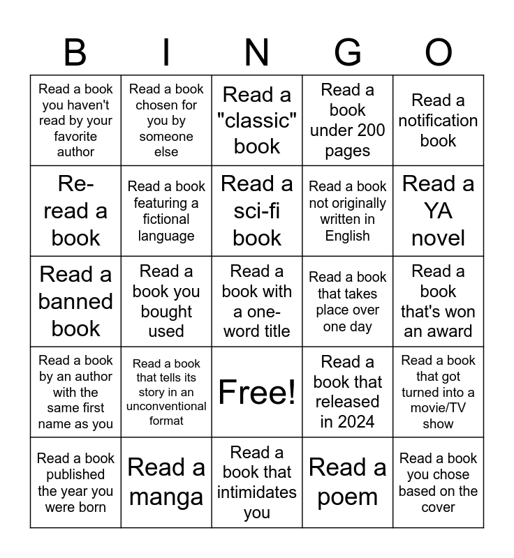 This bingo card has 26 words: Free!, Read a poem, Read a sci-fi book, Read a manga, Read a notification book, Read a book you haven't read by your favorite author, Re-read a book, Read a book chosen for you by someone else, Read a book that's won an award, Read a book that released in 2024, Read a book not originally written in English, Read a banned book, Read a book that got turned into a movie/TV show, Read a book published the year you were born, Read a book you bought used, Read a sequel, Read a book under 200 pages, Read a book by an author with the same first name as you, Read a "classic" book, Read a book with a one-word title, Read a YA novel, Read a book that intimidates you, Read a book that takes place over one day, Read a book that tells its story in an unconventional format, Read a book featuring a fictional language and Read a book you chose based on the cover.