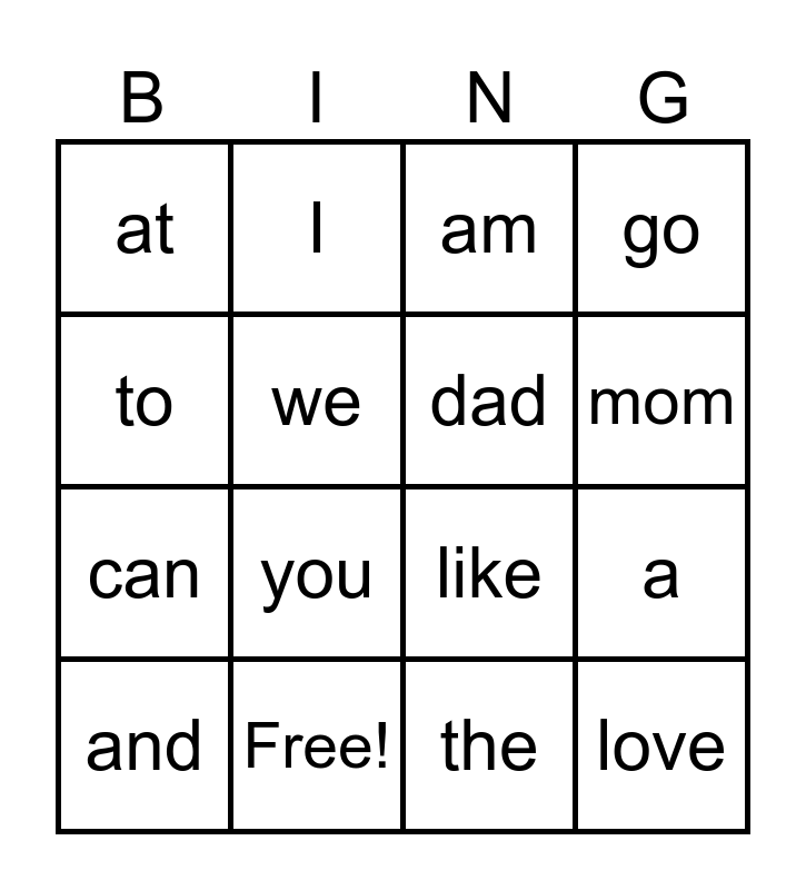 This bingo card has 16 words: Free!, a, am, at, can, I, like, the, to, we, and, go, you, mom, dad and love.