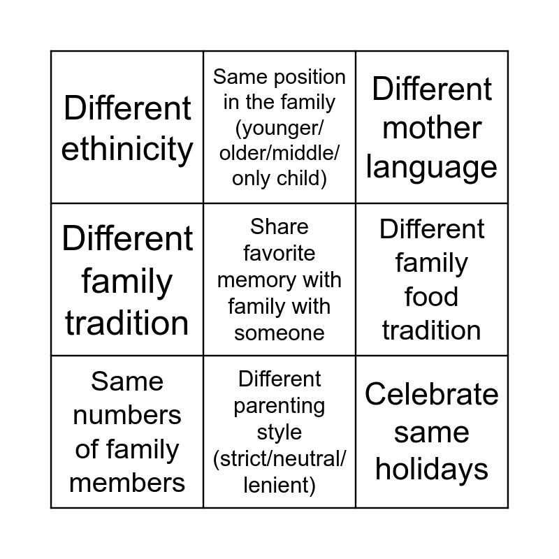 This bingo card has a free space and 8 words: Different family food tradition, Different mother language, Same position in the family (younger/ older/middle/ only child), Same numbers of family members, Different ethinicity, Celebrate same holidays, Different family tradition and Different parenting style (strict/neutral/ lenient).