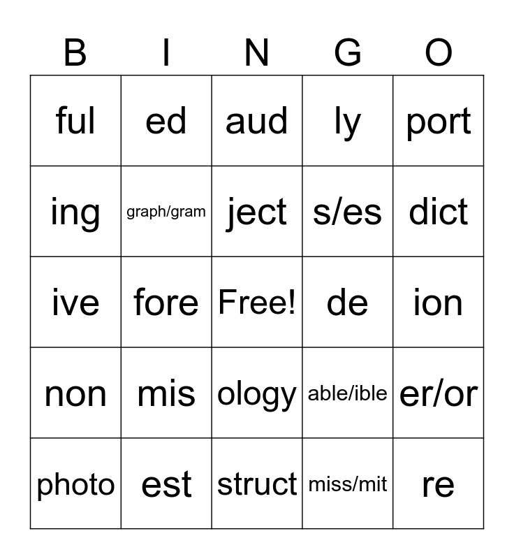 This bingo card has a free space and 41 words: dis/in/un, mis, pre, de, re, non, fore, dis, s/es, er/or, ing, ed, able/ible, ion, ive, est, ic, ly, less, ful, y, struct, rupt, port, tract, form, ject, cred, dict, scipt/script, flex/flect, aud, miss/mit, auto, photo, graph/gram, ology, bio, micro, scope and phon.