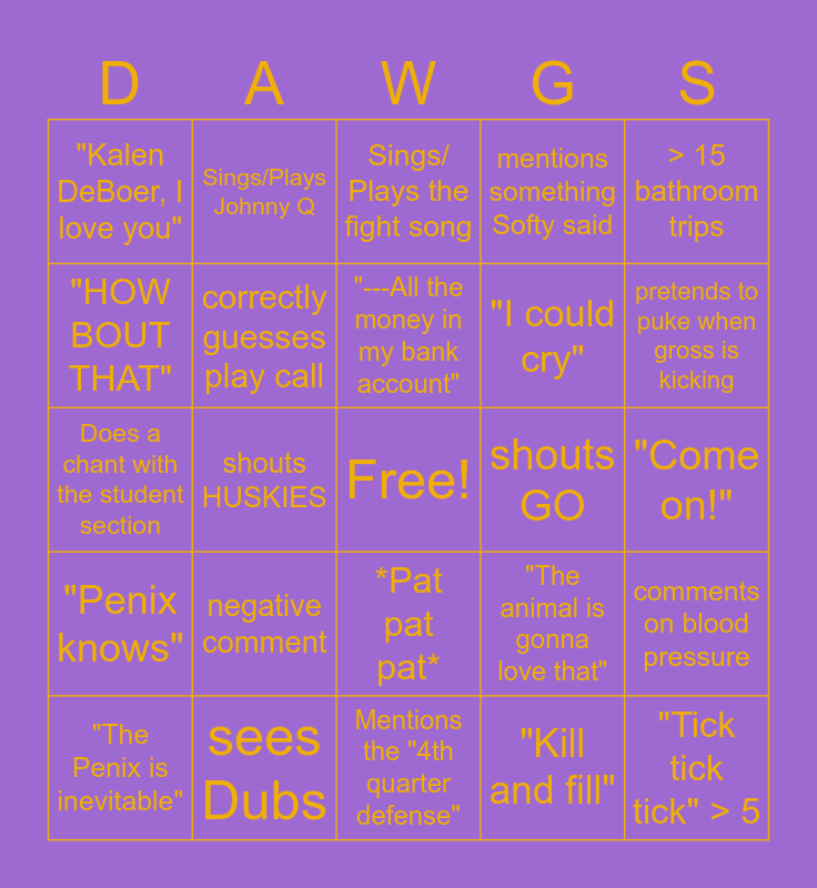 This bingo card has a free space and 24 words: negative comment, sees Dubs, "---All the money in my bank account", "The Penix is inevitable", > 15 bathroom trips, "Kalen DeBoer, I love you", "HOW BOUT THAT", Sings/Plays Johnny Q, shouts GO, *Pat pat pat*, "I could cry", Does a chant with the student section, "The animal is gonna love that", comments on blood pressure, correctly guesses play call, "Kill and fill", "Come on!", Sings/ Plays the fight song, pretends to puke when gross is kicking, shouts HUSKIES, "Tick tick tick" > 5, "Penix knows", mentions something Softy said and Mentions the "4th quarter defense".