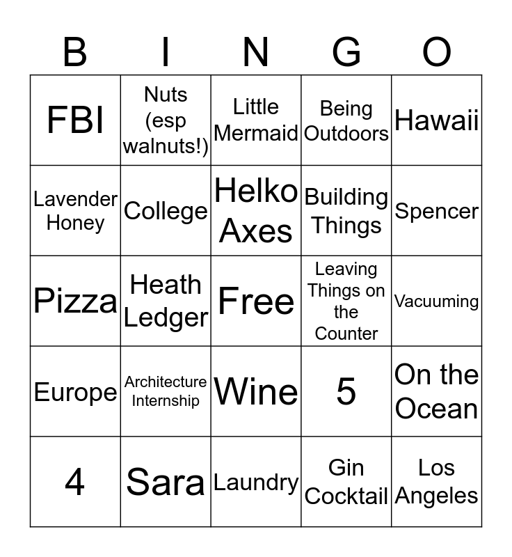 This bingo card has a free space and 24 words: Architecture Internship, Sara, Helko Axes, 4, Hawaii, FBI, Lavender Honey, Nuts (esp walnuts!), Leaving Things on the Counter, Wine, Building Things, Pizza, 5, On the Ocean, College, Gin Cocktail, Vacuuming, Little Mermaid, Spencer, Heath Ledger, Los Angeles, Europe, Being Outdoors and Laundry.