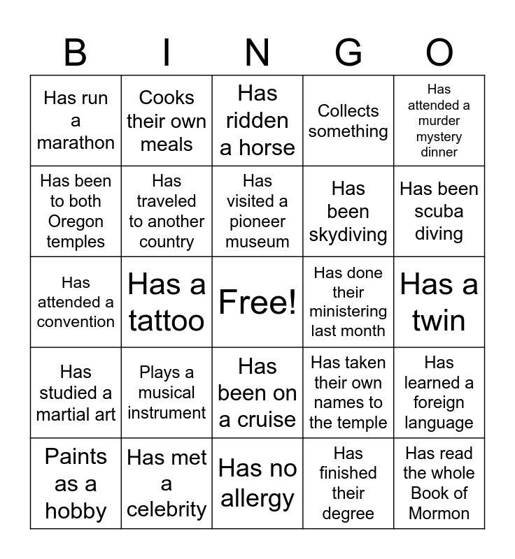 This bingo card has a free space and 51 words: Has been to Disneyland, Has read the whole Book of Mormon, Has served a mission, Has no allergy, Plays a musical instrument, Has a pet, Cooks their own meals, Has met a general authority, Has been to both Oregon temples, Has a sibling in the same YSA ward, Has traveled to another country, Collects something, Has learned a foreign language, Has taken their own names to the temple, Has a scripture mastery memorized, Has met a prophet, Has visited a pioneer museum, Has done their ministering last month, Has been to a BYU game, Has attended a murder mystery dinner, Has a tattoo, Has finished their degree, Has run a marathon, Has been skydiving, Has been to a luau, Has gone skiing, Has been scuba diving, Does yoga, Paints as a hobby, Has ridden a horse, Has learned to juggle, Has been to a pioneer trek, Has gone bungee jumping or zip lining, Has never been on a plane, Has attended a music festival, Has met a celebrity, Has never learned to swim, Has climbed a mountain, Has performed on a stage, Has learned sign language, Has a twin, Has studied a martial art, Has donated blood or plasma, Has never recieved a ticket, Has driven over 100 mph, Has been on a hot air balloon ride, Has attended a convention, Has surfed, Plays instruments, Has been on a cruise and Has earned Eagle Scout rank or Young Women Recognition award.