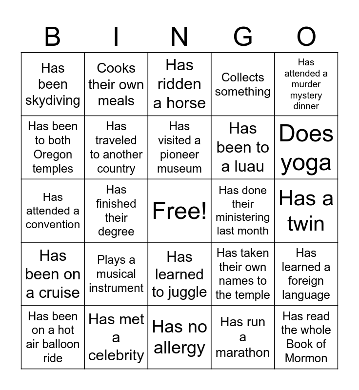 This bingo card has a free space and 50 words: Has been to Disneyland, Has read the whole Book of Mormon, Has served a mission, Has no allergy, Plays a musical instrument, Has a pet, Cooks their own meals, Has met a general authority, Has been to both Oregon temples, Has a sibling in the same YSA ward, Has traveled to another country, Collects something, Has learned a foreign language, Has taken their own names to the temple, Has a scripture mastery memorized, Has met a prophet, Has visited a pioneer museum, Has done their ministering last month, Has been to a BYU game, Has attended a murder mystery dinner, Has finished their degree, Has run a marathon, Has been skydiving, Has been to a luau, Has gone skiing, Has been scuba diving, Does yoga, Paints as a hobby, Has ridden a horse, Has learned to juggle, Has been to a pioneer trek, Has gone bungee jumping or zip lining, Has never been on a plane, Has attended a music festival, Has met a celebrity, Has never learned to swim, Has climbed a mountain, Has performed on a stage, Has learned sign language, Has a twin, Has studied a martial art, Has donated blood or plasma, Has never received a ticket, Has driven over 100 mph, Has been on a hot air balloon ride, Has attended a convention, Has surfed, Plays instruments, Has been on a cruise and Has earned Eagle Scout rank or Young Women Recognition award.