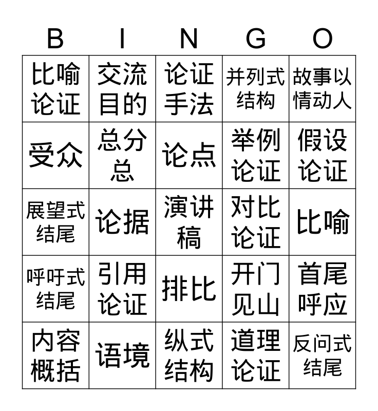 This bingo card has a free space and 24 words: 引用论证, 语境, 论点, 内容概括, 故事以情动人, 比喻论证, 受众, 交流目的, 对比论证, 排比, 举例论证, 展望式结尾, 开门见山, 首尾呼应, 总分总, 道理论证, 比喻, 论证手法, 假设论证, 论据, 反问式结尾, 呼吁式结尾, 并列式结构 and 纵式结构.