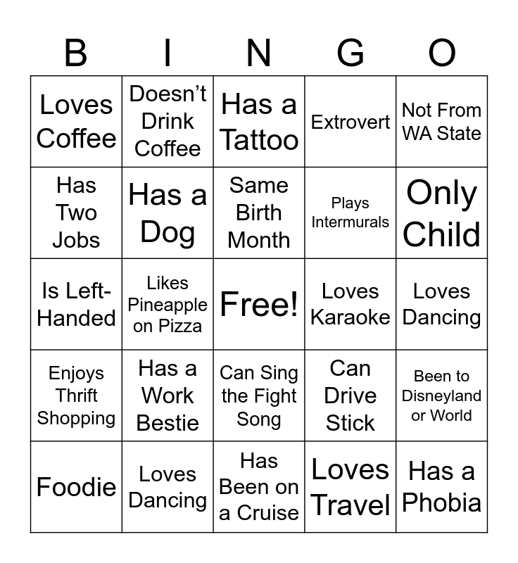 This bingo card has a free space and 34 words: Has a study playlist, Loves Travel, Vegetarian, Loves to Cook, Enjoys Thrift Shopping, Has a Dog, Not From WA State, Foodie, Doesn’t Drink Coffee, Built an App, Same Birth Month, Has a Tattoo, Can Speak 2+ Languages, Belongs to a Club, Loves Karaoke, Only Child, Loves Dancing, Is Left-Handed, Has a Work Bestie, Can Drive Stick, Can Sing the Fight Song, Same Birth Month, Loves Coffee, Loves Dancing, Has Been on a Cruise, Has a Phobia, Extrovert, Has Been to 3+ Continents, Plays Intermurals, Has Two Jobs, Does Yoga, Likes Pineapple on Pizza, Been to Disneyland or World and Never Been Up the Space Needle.