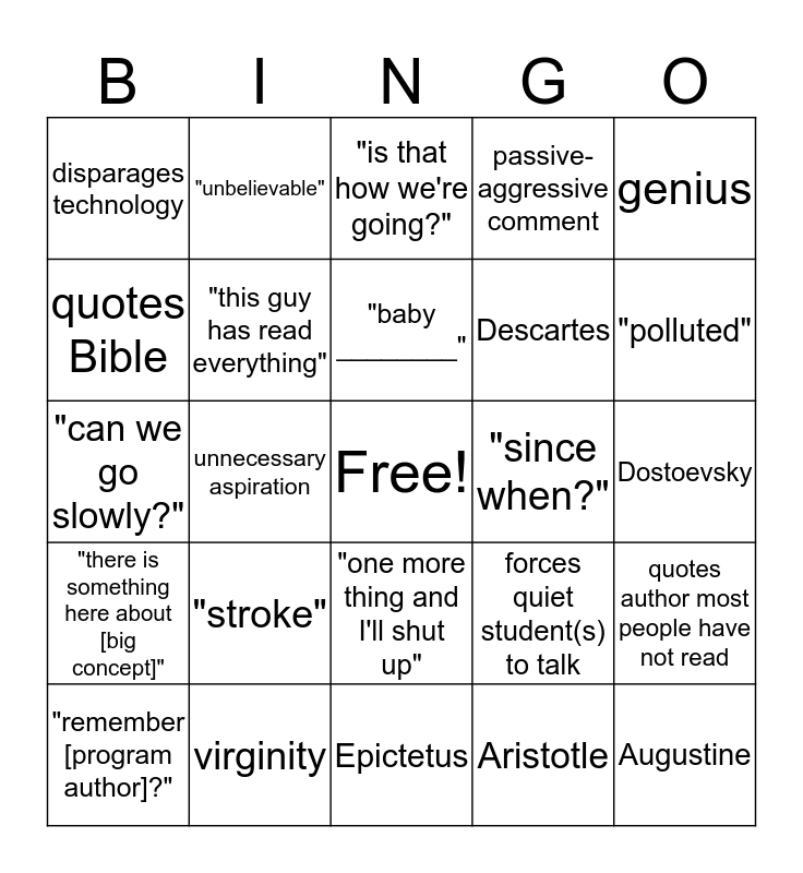 This bingo card has a free space and 24 words: "stroke", virginity, "baby ________", "remember [program author]?", genius, disparages technology, quotes Bible, "unbelievable", "since when?", "one more thing and I'll shut up", Descartes, "can we go slowly?", forces quiet student(s) to talk, quotes author most people have not read, "this guy has read everything", Aristotle, Dostoevsky, "is that how we're going?", "polluted", unnecessary aspiration, Augustine, "there is something here about [big concept]", passive-aggressive comment and Epictetus.