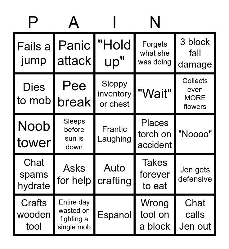 This bingo card has a free space and 24 words: Asks for help, Entire day wasted on fighting a single mob, Sloppy inventory or chest, Crafts wooden tool, 3 block fall damage, Fails a jump, Dies to mob, Panic attack, Places torch on accident, Auto crafting, "Wait", Noob tower, Takes forever to eat, Jen gets defensive, Pee break, Wrong tool on a block, "Noooo", "Hold up", Collects even MORE flowers, Sleeps before sun is down, Chat calls Jen out, Chat spams hydrate, Forgets what she was doing and Espanol.