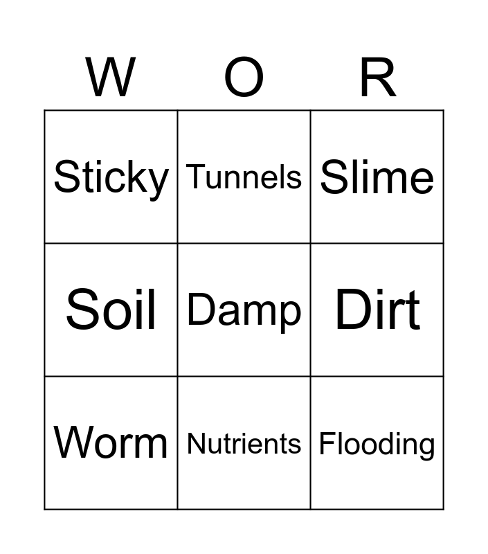 This bingo card has 9 words: Worm, Slime, Tunnels, Soil, Sticky, Dirt, Damp, Flooding and Nutrients.