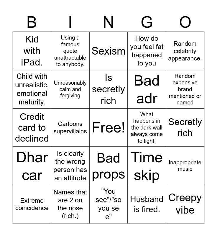 This bingo card has a free space and 39 words: Merch in video, Someone getting evicted., PS5, Time skip, Inappropriate music, Dhar car, Cartoons supervillains, Darman studio office in the video., What happens in the dark wall always come to light., Secretly rich, Child with unrealistic, emotional maturity., Using a famous quote unattractable to anybody., Parking lot confrontation., Random expensive brand mentioned or named, Credit card to declined, Is clearly the wrong person has an attitude, Bad props, How do you feel fat happened to you, Bad green screen, Extreme coincidence, Unreasonably calm and forgiving, Is secretly rich, Husband is fired., Random celebrity appearance., Flashback, Names that are 2 on the nose (rich.), "You see"/"so you see", Dar man voice over, Spaghetti, Kid with iPad., Bad sound effect., Secretly rich, Bad adr, Creepy vibe, The same house as always, Racism, Sexism, Oblivious parent with demon child and I am the manager.