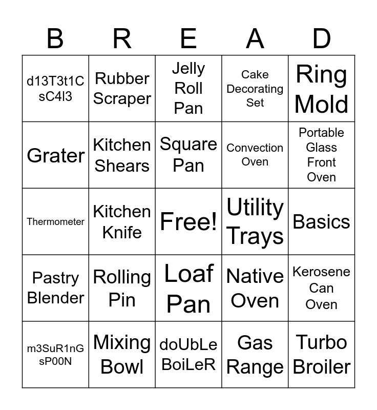 This bingo card has a free space and 24 words: m3SuR1nG sP00N, Rolling Pin, Square Pan, Gas Range, Ring Mold, d13T3t1C sC4l3, Rubber Scraper, Jelly Roll Pan, Utility Trays, Basics, Thermometer, Kitchen Shears, Native Oven, Kerosene Can Oven, Grater, Mixing Bowl, doUbLe BoiLeR, Cake Decorating Set, Portable Glass Front Oven, Pastry Blender, Kitchen Knife, Loaf Pan, Convection Oven and Turbo Broiler.