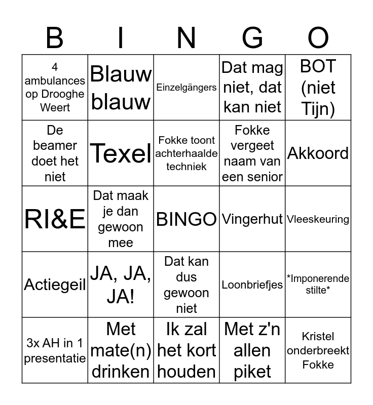This bingo card has a free space and 29 words: 3x AH in 1 presentatie, Bloemendaal, Dat maak je dan gewoon mee, Een nat broekje halen, 4 ambulances op Drooghe Weert, Einzelgängers, Texel, JA, JA, JA!, Vingerhut, Met mate(n) drinken, Vleeskeuring, Kristel onderbreekt Fokke, Ik zal het kort houden, Met z'n allen piket, Akkoord, Kris, kris,..., Dat kan dus gewoon niet, Actiegeil, BOT (niet Tijn), RI&E, Loonbriefjes, Razende Bol, Fokke vergeet naam van een senior, De beamer doet het niet, Dat mag niet, dat kan niet, Blauw blauw, *Imponerende stilte*, Fokke toont achterhaalde techniek and Post niet goed opgeruimd na zaterdagavond.