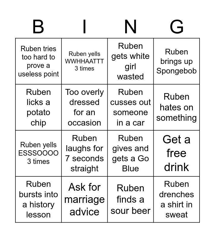 This bingo card has 16 words: Ask for marriage advice, Get a free drink, Ruben gets white girl wasted, Ruben tries too hard to prove a useless point, Ruben yells ESSSOOOO 3 times, Ruben yells WWHHAATTT 3 times, Ruben gives and gets a Go Blue, Ruben finds a sour beer, Ruben licks a potato chip, Too overly dressed for an occasion, Ruben bursts into a history lesson, Ruben brings up Spongebob, Ruben laughs for 7 seconds straight, Ruben hates on something, Ruben cusses out someone in a car and Ruben drenches a shirt in sweat.
