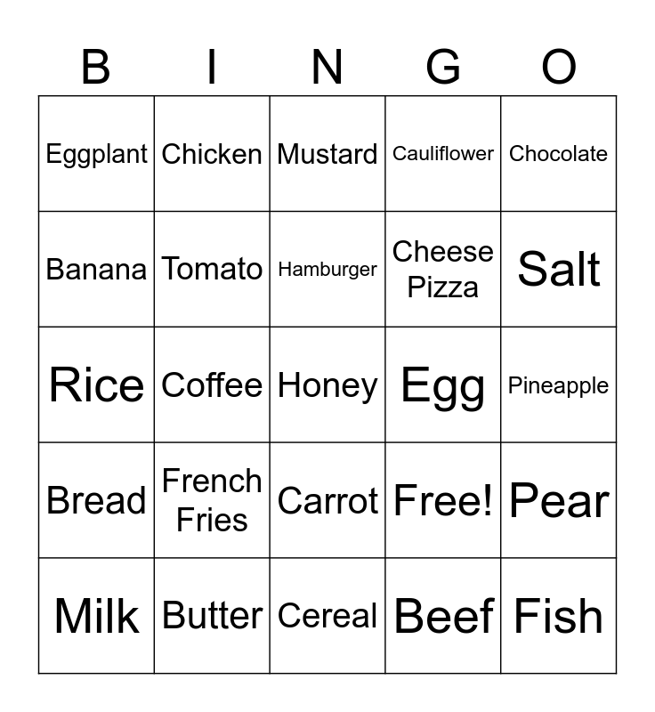 This bingo card has 25 words: French Fries, Cereal, Hamburger, Milk, Chocolate, Eggplant, Banana, Chicken, Egg, Carrot, Cheese Pizza, Rice, Free!, Pear, Tomato, Fish, Pineapple, Mustard, Salt, Coffee, Honey, Butter, Bread, Cauliflower and Beef.