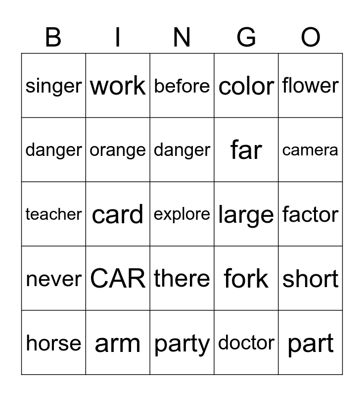 This bingo card has a free space and 24 words: CAR, arm, danger, horse, flower, singer, danger, work, large, there, far, teacher, fork, short, orange, doctor, factor, before, camera, card, part, never, color and party.