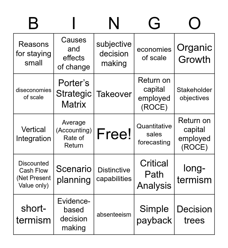 This bingo card has a free space and 35 words: SWOT analysis, PESTLE, Ansoff’s Matrix, Porter’s Strategic Matrix, Distinctive capabilities, economies of scale, diseconomies of scale, Merger, Takeover, Horizontal Integration, Vertical Integration, Organic Growth, Inorganic Growth, Rapid growth, Reasons for staying small, Quantitative sales forecasting, Simple payback, Average (Accounting) Rate of Return, Discounted Cash Flow (Net Present Value only), Decision trees, Critical Path Analysis, short-termism, long-termism, Evidence-based decision making, subjective decision making, Stakeholder objectives, Corporate Social Responsibility (CSR), Gearing ratio, Return on capital employed (ROCE), Return on capital employed (ROCE), labour turnover and retention, absenteeism, Scenario planning, Causes and effects of change and Human resource strategies to increase productivity.