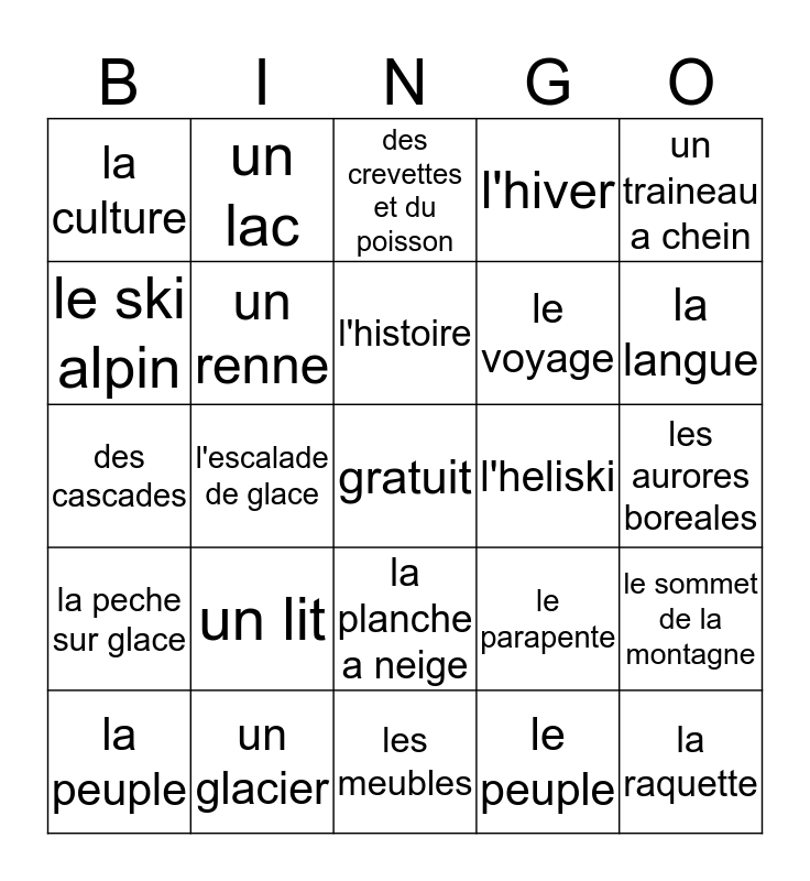 This bingo card has a free space and 24 words: un lit, un glacier, l'histoire, la peuple, un traineau a chein, la culture, le ski alpin, un lac, l'heliski, la planche a neige, le voyage, des cascades, le parapente, le sommet de la montagne, un renne, le peuple, les aurores boreales, des crevettes et du poisson, la langue, l'escalade de glace, la raquette, la peche sur glace, l'hiver and les meubles.