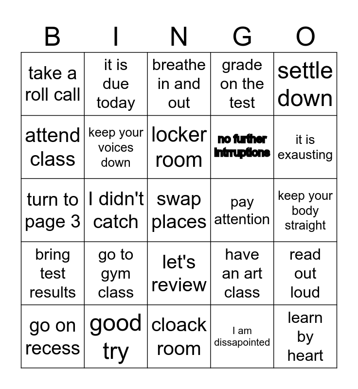 This bingo card has 25 words: go to gym class, cloack room, locker room, go on recess, settle down, take a roll call, attend class, it is due today, pay attention, let's review, no further intrruptions, turn to page 3, have an art class, read out loud, keep your voices down, learn by heart, keep your body straight, breathe in and out, it is exausting, I didn't catch, swap places, good try, bring test results, grade on the test and I am dissapointed.
