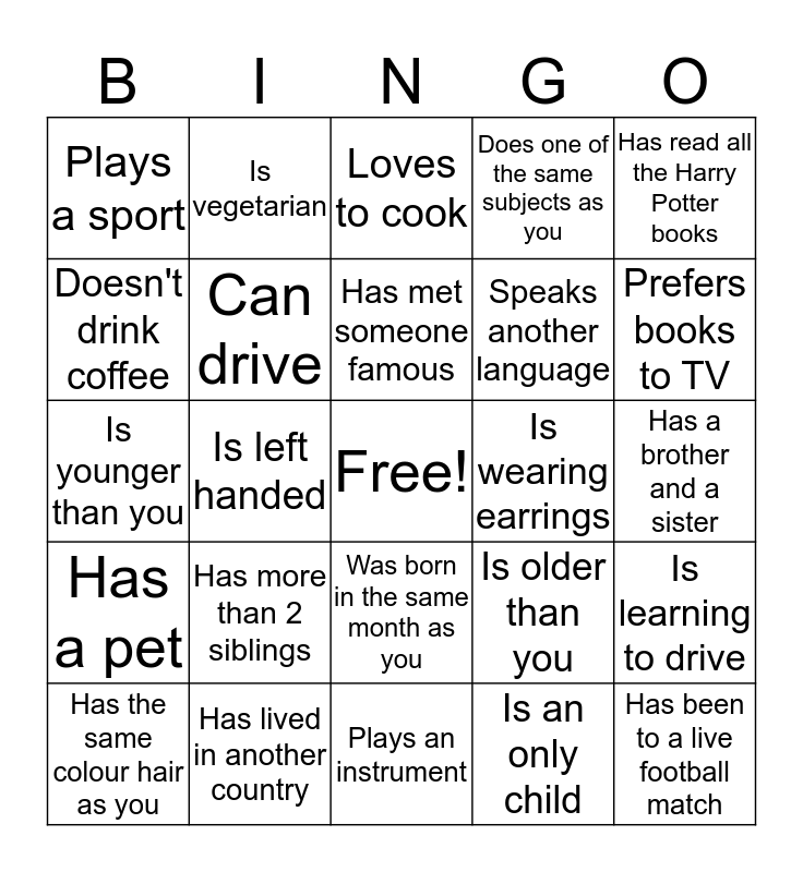 This bingo card has a free space and 24 words: Has more than 2 siblings, Has lived in another country, Has met someone famous, Has the same colour hair as you, Has read all the Harry Potter books, Plays a sport, Doesn't drink coffee, Is vegetarian, Is wearing earrings, Was born in the same month as you, Speaks another language, Is younger than you, Is older than you, Is learning to drive, Can drive, Is an only child, Has a brother and a sister, Loves to cook, Prefers books to TV, Is left handed, Has been to a live football match, Has a pet, Does one of the same subjects as you and Plays an instrument.