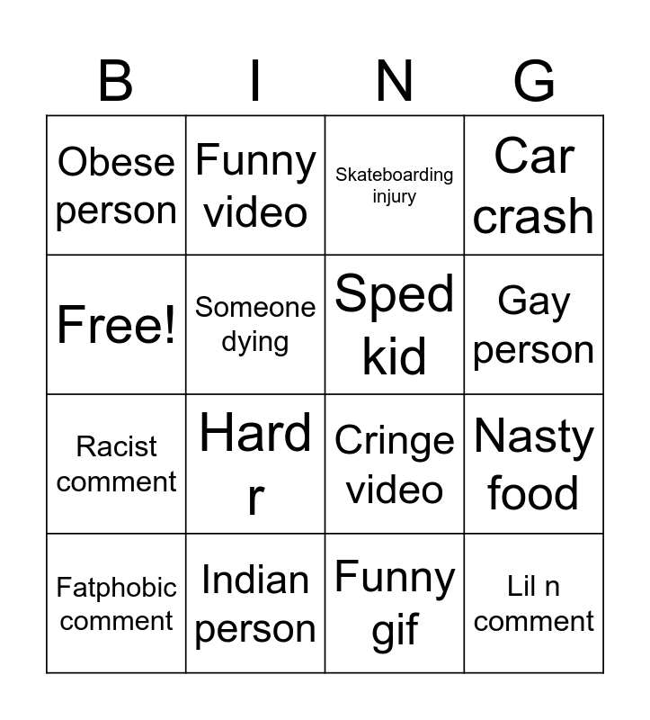 This bingo card has 16 words: Indian person, Nasty food, Skateboarding injury, Obese person, Racist comment, Funny video, Cringe video, Funny gif, Free!, Someone dying, Fatphobic comment, Car crash, Hard r, Gay person, Sped kid and Lil n comment.