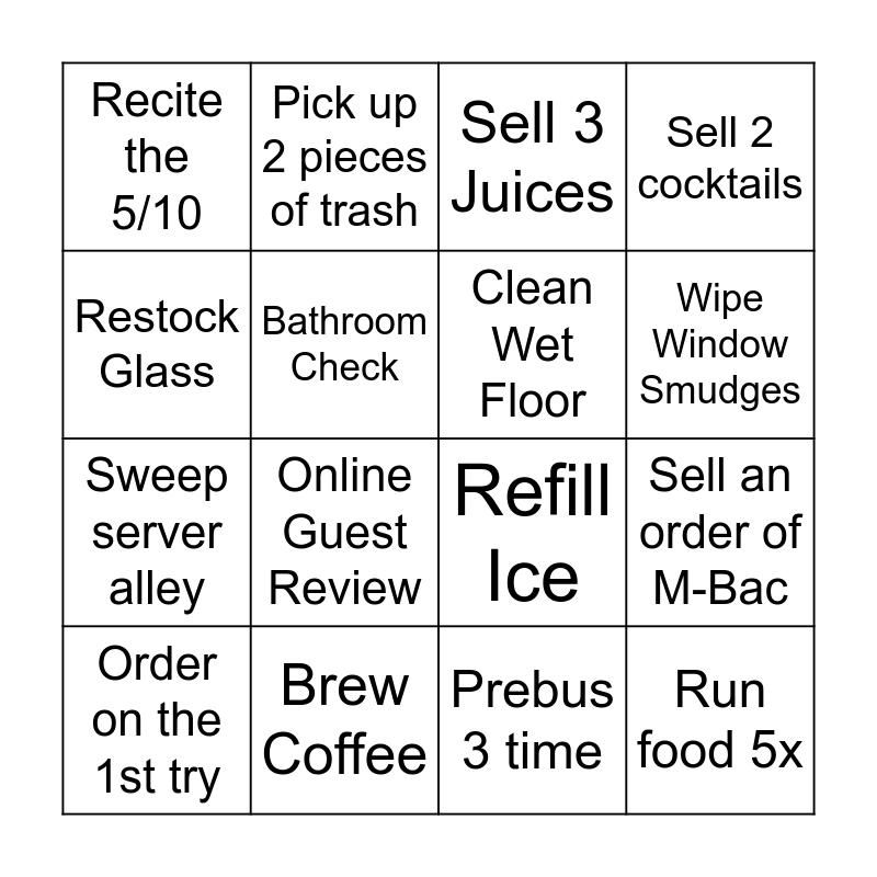 This bingo card has 16 words: Brew Coffee, Sell an order of M-Bac, Sell 3 Juices, Recite the 5/10, Sweep server alley, Pick up 2 pieces of trash, Refill Ice, Prebus 3 time, Restock Glass, Bathroom Check, Order on the 1st try, Sell 2 cocktails, Online Guest Review, Wipe Window Smudges, Clean Wet Floor and Run food 5x.