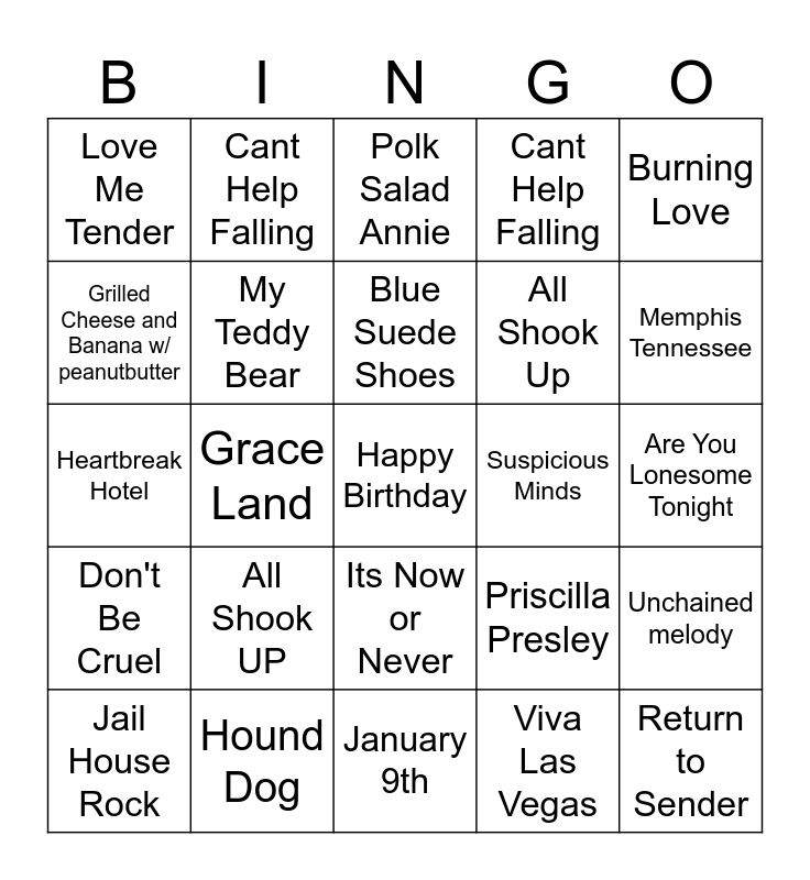 This bingo card has a free space and 24 words: All Shook UP, Hound Dog, Blue Suede Shoes, Jail House Rock, Burning Love, Love Me Tender, Grilled Cheese and Banana w/ peanutbutter, Cant Help Falling, Suspicious Minds, Its Now or Never, All Shook Up, Heartbreak Hotel, Priscilla Presley, Unchained melody, My Teddy Bear, Viva Las Vegas, Are You Lonesome Tonight, Polk Salad Annie, Memphis Tennessee, Grace Land, Return to Sender, Don't Be Cruel, Cant Help Falling and January 9th.