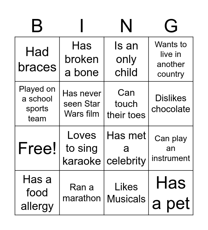 This bingo card has 20 words: Can play an instrument, Has a tattoo, Is an only child, Is a lefty, Has a food allergy, Played on a school sports team, Ran a marathon, Had braces, Free!, Has broken a bone, Loves to sing karaoke, Has met a celebrity, Has never seen Star Wars film, Has a pet, Can touch their toes, Has a Facebook account, Dislikes chocolate, Wants to live in another country, Likes Musicals and Is afraid of spiders.