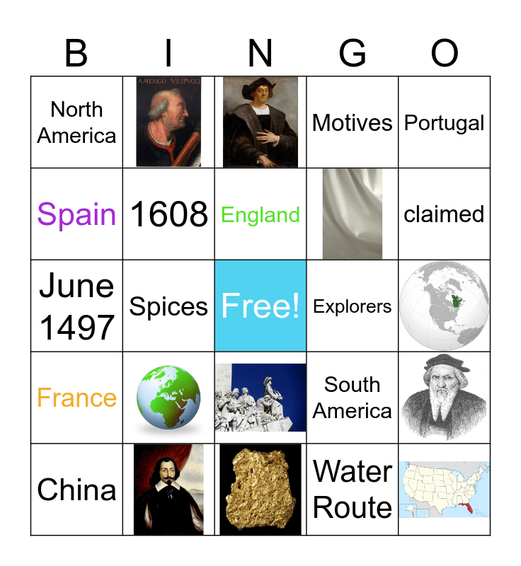This bingo card has 10 images, a free space and 14 words: England, China, Portugal, North America, Spain, Explorers, June 1497, South America, 1608, Water Route, claimed, Spices, France and Motives.