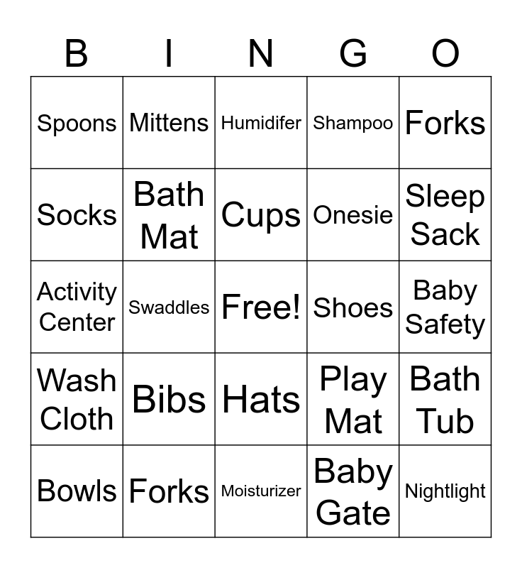 This bingo card has a free space and 24 words: Bibs, Forks, Cups, Bowls, Forks, Spoons, Socks, Mittens, Shoes, Hats, Onesie, Activity Center, Play Mat, Bath Tub, Bath Mat, Baby Gate, Baby Safety, Humidifer, Sleep Sack, Swaddles, Nightlight, Wash Cloth, Shampoo and Moisturizer.