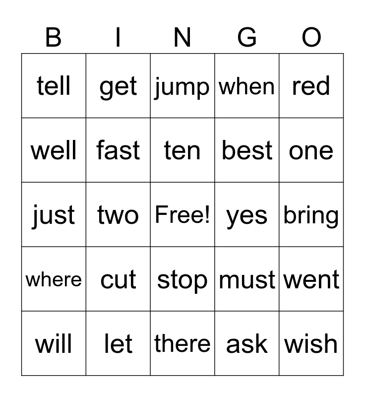 This bingo card has a free space and 24 words: cut, let, ten, will, red, tell, well, get, yes, stop, best, just, must, went, fast, ask, bring, jump, one, two, wish, where, when and there.