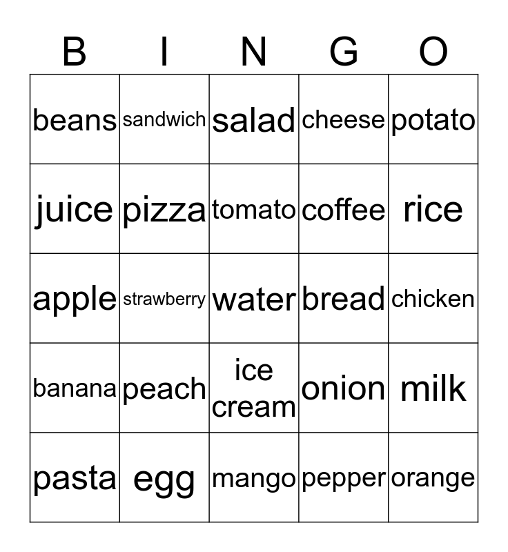This bingo card has a free space and 24 words: peach, egg, tomato, pasta, potato, beans, juice, sandwich, bread, ice cream, coffee, apple, onion, milk, pizza, pepper, chicken, salad, rice, strawberry, orange, banana, cheese and mango.