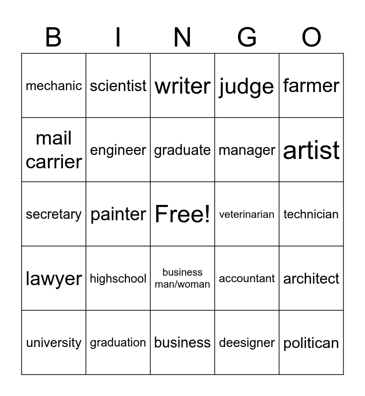 This bingo card has a free space and 24 words: highschool, graduation, graduate, university, farmer, mechanic, mail carrier, scientist, veterinarian, business man/woman, manager, secretary, accountant, architect, engineer, deesigner, technician, writer, artist, painter, politican, lawyer, judge and business.