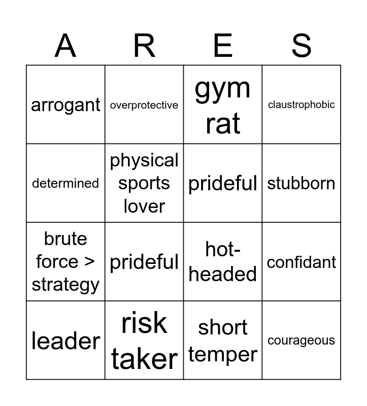 This bingo card has 16 words: risk taker, confidant, gym rat, arrogant, brute force > strategy, overprotective, hot-headed, short temper, determined, physical sports lover, leader, claustrophobic, prideful, stubborn, prideful and courageous.