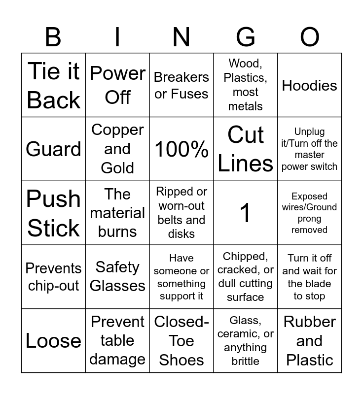 This bingo card has 25 words: Safety Glasses, Closed-Toe Shoes, 100%, Loose, Hoodies, Tie it Back, Guard, Power Off, 1, Have someone or something support it, Cut Lines, Push Stick, Chipped, cracked, or dull cutting surface, Turn it off and wait for the blade to stop, Copper and Gold, Rubber and Plastic, Exposed wires/Ground prong removed, Breakers or Fuses, Unplug it/Turn off the master power switch, The material burns, Ripped or worn-out belts and disks, Prevent table damage, Prevents chip-out, Wood, Plastics, most metals and Glass, ceramic, or anything brittle.