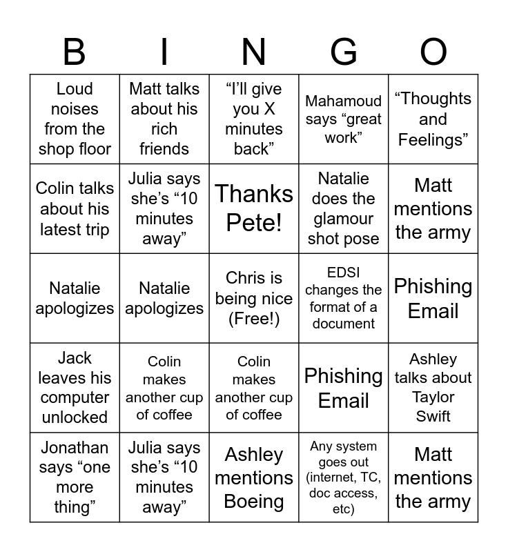 This bingo card has a free space and 48 words: Jeff says “Go Beyond”, Matt mentions the army, Jonathan says “one more thing”, Ashley mentions Boeing, Colin makes another cup of coffee, Jack leaves his computer unlocked, Matt talks about his rich friends, Jonathan is on 3 zoom calls at once, Colin talks about his latest trip, Colin draws on the whiteboard, Julia says she’s “10 minutes away”, Mahamoud says “great work”, Ashley talks about Taylor Swift, Phishing Email, Jeff is a hater, “Thanks Pete”, Thanks Pete!, EDSI changes the format of a document, “I’ll give you X minutes back”, “Thoughts and Feelings”, Natalie apologizes, Any system goes out (internet, TC, doc access, etc), Loud noises from the shop floor, Natalie does the glamour shot pose, Jeff says “Go Beyond”, Matt mentions the army, Jonathan says “one more thing”, Ashley mentions Boeing, Colin makes another cup of coffee, Jack leaves his computer unlocked, Matt talks about his rich friends, Jonathan is on 3 zoom calls at once, Colin talks about his latest trip, Colin draws on the whiteboard, Julia says she’s “10 minutes away”, Mahamoud says “great work”, Ashley talks about Taylor Swift, Phishing Email, Jeff is a hater, “Thanks Pete”, Thanks Pete!, EDSI changes the format of a document, “I’ll give you X minutes back”, “Thoughts and Feelings”, Natalie apologizes, Any system goes out (internet, TC, doc access, etc), Loud noises from the shop floor and Natalie does the glamour shot pose.