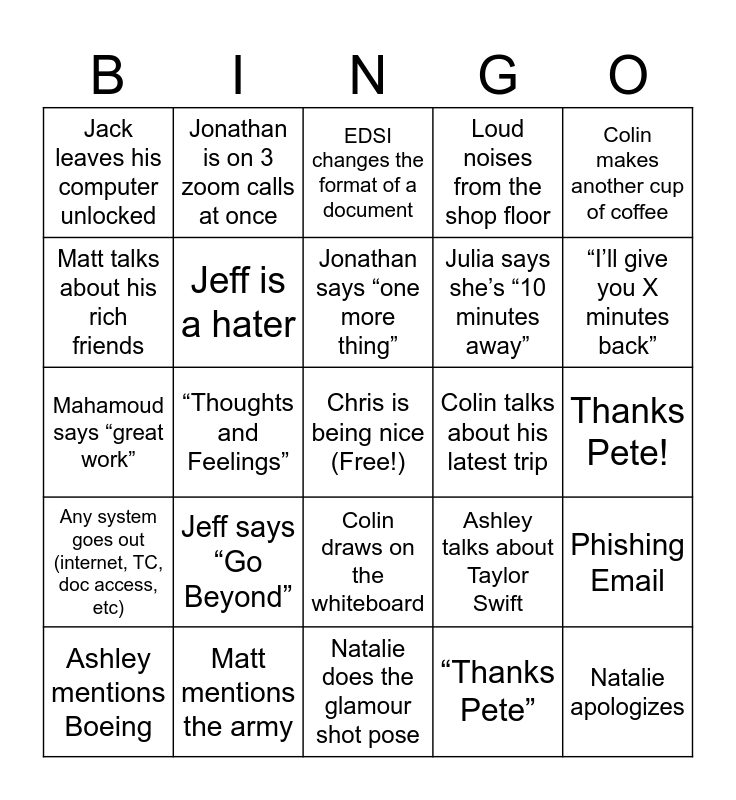 This bingo card has a free space and 24 words: Jeff says “Go Beyond”, Matt mentions the army, Jonathan says “one more thing”, Ashley mentions Boeing, Colin makes another cup of coffee, Jack leaves his computer unlocked, Matt talks about his rich friends, Jonathan is on 3 zoom calls at once, Colin talks about his latest trip, Colin draws on the whiteboard, Julia says she’s “10 minutes away”, Mahamoud says “great work”, Ashley talks about Taylor Swift, Phishing Email, Jeff is a hater, “Thanks Pete”, Thanks Pete!, EDSI changes the format of a document, “I’ll give you X minutes back”, “Thoughts and Feelings”, Natalie apologizes, Any system goes out (internet, TC, doc access, etc), Loud noises from the shop floor and Natalie does the glamour shot pose.