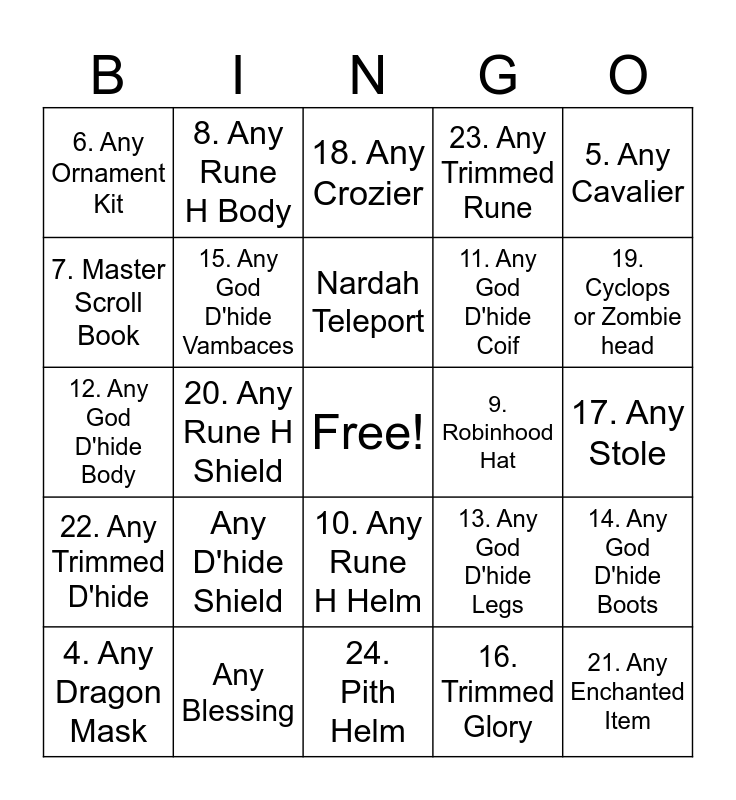 This bingo card has a free space and 24 words: Any D'hide Shield, Any Blessing, Nardah Teleport, 4. Any Dragon Mask, 5. Any Cavalier, 6. Any Ornament Kit, 7. Master Scroll Book, 8. Any Rune H Body, 9. Robinhood Hat, 10. Any Rune H Helm, 11. Any God D'hide Coif, 12. Any God D'hide Body, 13. Any God D'hide Legs, 14. Any God D'hide Boots, 15. Any God D'hide Vambaces, 16. Trimmed Glory, 17. Any Stole, 18. Any Crozier, 19. Cyclops or Zombie head, 20. Any Rune H Shield, 21. Any Enchanted Item, 22. Any Trimmed D'hide, 23. Any Trimmed Rune and 24. Pith Helm.