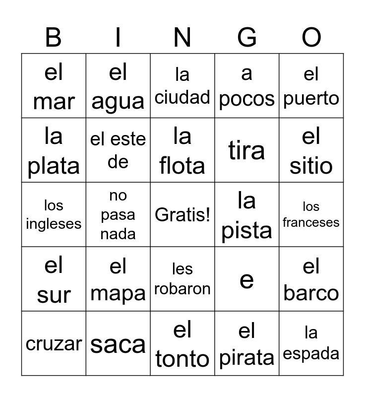This bingo card has a free space and 24 words: el mapa, saca, la flota, cruzar, el puerto, el mar, la plata, el agua, la pista, les robaron, tira, los ingleses, e, el barco, el este de, el pirata, los franceses, la ciudad, el sitio, no pasa nada, la espada, el sur, a pocos and el tonto.