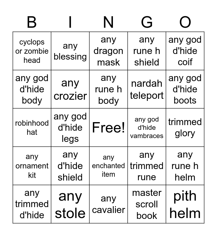 This bingo card has a free space and 24 words: any d'hide shield, any stole, any rune h body, any trimmed d'hide, any god d'hide coif, cyclops or zombie head, any god d'hide body, any blessing, any god d'hide vambraces, any enchanted item, nardah teleport, robinhood hat, any trimmed rune, any rune h helm, any crozier, master scroll book, trimmed glory, any dragon mask, any god d'hide boots, any god d'hide legs, pith helm, any ornament kit, any rune h shield and any cavalier.