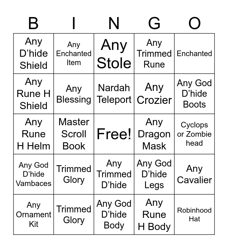 This bingo card has a free space and 29 words: God d'Hide Legs, Trimmed Glory, Any Stole, Trimmed D'Hide, Enchanted, Any D’hide Shield, Any Blessing, Nardah Teleport, Any Dragon Mask, Any Cavalier, Any Ornament Kit, Master Scroll Book, Any Rune H Body, Robinhood Hat, Any Rune H Helm, Any God D’hide Coif, Any God D’hide Body, Any God D’hide Legs, Any God D’hide Boots, Any God D’hide Vambaces, Trimmed Glory, Any Stole, Any Crozier, Cyclops or Zombie head, Any Rune H Shield, Any Enchanted Item, Any Trimmed D’hide, Any Trimmed Rune and Pith Healm.