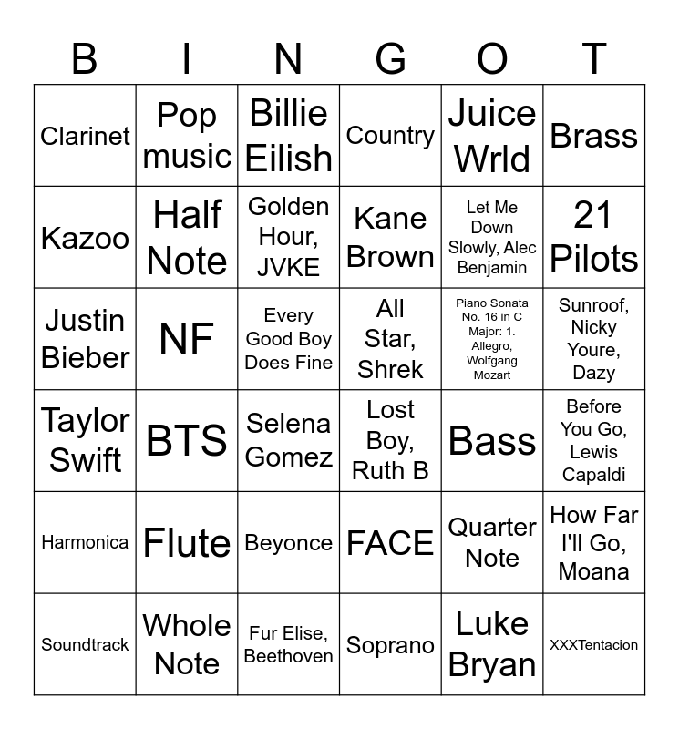 This bingo card has 54 words: Rap/Hip Hop, All Star, Shrek, Rap Battle, Flute, Sunroof, Nicky Youre, Dazy, XXXTentacion, Country, Lucid Dreams, Juice Wrld, Brass, Post Malone, Clarinet, Soprano, Lost Boy, Ruth B, Selena Gomez, Man In The Mirror, Michael Jackson, Bass, Justin Bieber, Golden Hour, JVKE, Michael Jackson, Every Good Boy Does Fine, Taylor Swift, Beyonce, NF, Juice Wrld, Triangle, Pop music, Soundtrack, Count On Me, Bruno Mars, FACE, Before You Go, Lewis Capaldi, Deviltown, Cavetown, Fur Elise, Beethoven, Tempo, Lizzo, Billie Eilish, Luke Bryan, Let Me Down Slowly, Alec Benjamin, BTS, Harmonica, Kazoo, Djembe, Guitar, Trombone, Piccolo, Piano Sonata No. 16 in C Major: 1. Allegro, Wolfgang Mozart, girl in red, Whole Note, Quarter Note, Half Note, 21 Pilots, Kane Brown, Nirvana, How Far I'll Go, Moana and Let It Go, Frozen.