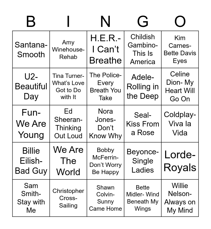 This bingo card has 26 words: Bobby McFerrin- Don’t Worry Be Happy, Bette Midler- Wind Beneath My Wings, The Police- Every Breath You Take, Christopher Cross- Sailing, Kim Carnes- Bette Davis Eyes, Santana- Smooth, U2- Beautiful Day, Amy Winehouse- Rehab, Coldplay- Viva la Vida, Beyonce- Single Ladies, Adele- Rolling in the Deep, Fun- We Are Young, Lorde- Royals, Sam Smith- Stay with Me, Ed Sheeran- Thinking Out Loud, Bruno Mars- That’s What I Like, Childish Gambino- This Is America, Billie Eilish- Bad Guy, H.E.R.- I Can’t Breathe, Nora Jones- Don’t Know Why, Celine Dion- My Heart Will Go On, Shawn Colvin- Sunny Came Home, Seal- Kiss From a Rose, We Are The World, Tina Turner- What’s Love Got to Do with It and Willie Nelson- Always on My Mind.
