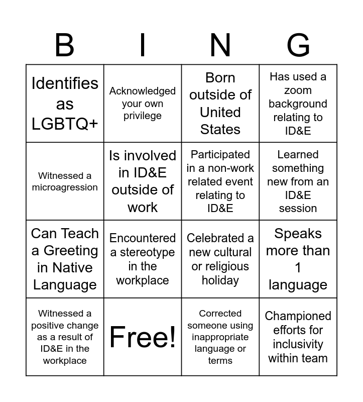 This bingo card has 16 words: Free!, Speaks more than 1 language, Born outside of United States, Identifies as LGBTQ+, Can Teach a Greeting in Native Language, Acknowledged your own privilege, Celebrated a new cultural or religious holiday, Corrected someone using inappropriate language or terms, Witnessed a microagression, Is involved in ID&E outside of work, Witnessed a positive change as a result of ID&E in the workplace, Has used a zoom background relating to ID&E, Encountered a stereotype in the workplace, Learned something new from an ID&E session, Participated in a non-work related event relating to ID&E and Championed efforts for inclusivity within team.