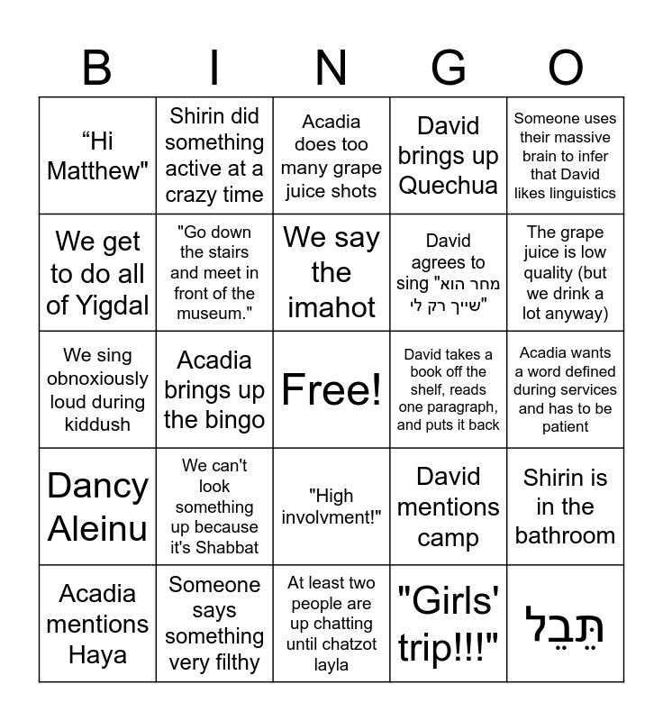This bingo card has a free space and 39 words: Shirin wears an absolute banger of an outfit, "Hi David", Acadia forgets that Conservatives have a different V'ahavta, "Go down the stairs and meet in front of the museum.", Acadia mentions Haya, "High involvment!", We say the imahot, David and Ky speak some Chinese, Someone uses their massive brain to infer that David likes linguistics, Dancy Aleinu, Acadia brings up the bingo, David brings up Quechua, תֵּבֵל, Acadia wants a word defined during services and has to be patient, David takes a book off the shelf, reads one paragraph, and puts it back, We can't look something up because it's Shabbat, David disses other places in favour of Chicago, “Hi Matthew", We mix up melodies in Kabbalat Shabbat, David mentions camp, We get to do all of Yigdal, At least two people are up chatting until chatzot layla, David agrees to sing "מחר הוא שייך רק לי", The grape juice is low quality (but we drink a lot anyway), "You don't have to go home, but you can't stay here.", Engineering professors suuuuck, "I have homework to do, but it's not due until midnight.", "That's just most guys!", Ky makes fun of David after handwashing, Shirin did something active at a crazy time, We ignore family style, The wine is bad, but eh, who cares, it's wine, Acadia does too many grape juice shots, Someone says something very filthy, "Girls' trip!!!", "Boys' trip!!!", Shirin is in the bathroom, We sing obnoxiously loud during kiddush and The conversation turns to Israeli politics and everyone is a little on edge..