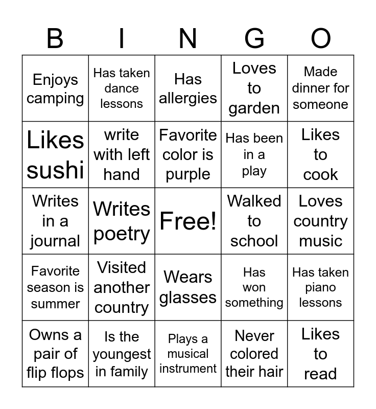 This bingo card has a free space and 71 words: Is wearing blue, Has taken dance lessons, Likes tomatoes, Has a pet, Plays a musical instrument, Speaks two languages, Loves to garden, Has broken a bone, Has been in a play, Loves to swim, Owns a pair of flip flops, Has been to camp, Likes to cook, Enjoys camping, Has been to the ocean, Writes in a journal, Has won something, Made dinner for someone, Is the oldest child, Loves country music, Visited another country, Likes to read, Has taken piano lessons, Sings in a choir, Has painted toenails, Has gone roller blading, Has run a 5K, Has run a half marathon, Has a Facebook account, Has baked bread, Is the youngest in family, Has had stitches, Has brown eyes, Has naturally curly hair, Never colored their hair, Exercises regularly, Plays or played on a sports team, Never been to Disneyland, Likes sushi, Is wearing earrings, Wears glasses, Born in June, July or August, Favorite season is summer, Gave a compliment today, Likes to go fishing, Favorite pizza is pepperoni, Born in another state, write with left hand, More than two siblings, Did not have soda today, Likes chocolate, Eats vegetables daily, Walked to school, Taught a lesson, Is afraid of spiders, Knows how to knit or crochet, Favorite color is purple, Made your bed today, Does not drink milk, Had braces, Was born in December, Chooses salty over sweet, Writes poetry, Flosses once a day, Can whistle, Is extremely ticklish, Has allergies, Favorite flower is a rose, Has read the whole BOM, Has been to FSY and Has visited Utah.
