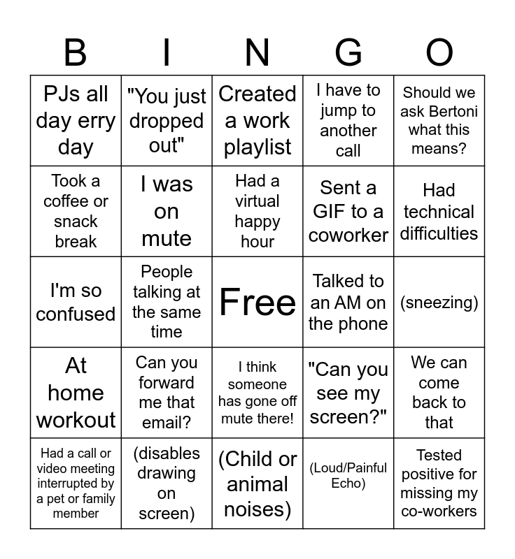 This bingo card has a free space and 77 words: "Can you hear me?", Put pants on before dialing, Created a work playlist, Sent a bitmoji/emoji in an email, Did household chores on your "lunch break", Discovered a new snack, I have to jump to another call, Slept in late, Showed a pet on a video call, Netflix and lunch, Had a call or video meeting interrupted by a pet or family member, Drank a glass of water, Talked to an AM on the phone, Had technical difficulties, Talked to someone outside of WCC, I was on mute, Took an online quiz #buzzfeed, "Can you see my screen?", Wore PJ's all day, Took a coffee or snack break, At home workout, Had a virtual happy hour, Sent a GIF to a coworker, Should we ask Bertoni what this means?, PJs all day erry day, Coronavirus, Skype call from bed, Nah, you go first, I'll be right back, Eat all my iso snacks, Substitute arvo coffee with wine, Is there a test for ____?, "... you're on mute!", We can come back to that, I'm so confused, "You just dropped out", (Sound of a vacuum), Movie reference someone doesn't understand, (sneezing), At home workout, I hadn't really thought about that, Let me think about that, I'll update the screens, Zoom virtual background, Stop drawing on my screen, (disables drawing on screen), Uh, ___ you're still sharing..., I have to jump to another call, (Sound of someone typing), ___ has joined the meeting, (Coughing sound), (Child or animal noises), Can you hear me?, Is anyone back?, Is everyone here?, Waiting in the zoom lobby, I was on mute, We need to fix line ___, Can you see my screen?, Awkward Silence......, People talking at the same time, Sorry, I was having connection issues, Put pants on before dialling, How is this supposed to work?, Should we ask ___?, Did we forget ____?, Netflix and lunch, (Loud/Painful Echo), Seeing Colleague's bedroom, When VPN or EMS doesn't like you, Driving/Traffic sounds, I think someone has gone off mute there!, Wfh Spotify, Tested positive for missing my co-workers, Virtual kitchen runs, Can you forward me that email? and Late to work even if its work from home.