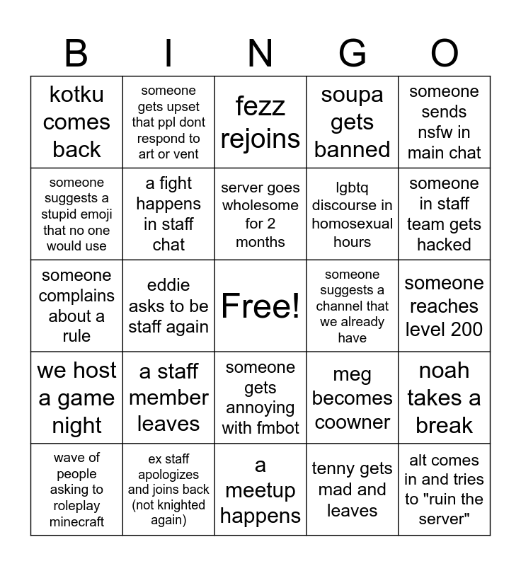 This bingo card has a free space and 24 words: a staff member leaves, ex staff apologizes and joins back (not knighted again), server goes wholesome for 2 months, wave of people asking to roleplay minecraft, someone sends nsfw in main chat, kotku comes back, someone suggests a stupid emoji that no one would use, someone gets upset that ppl dont respond to art or vent, someone suggests a channel that we already have, someone gets annoying with fmbot, lgbtq discourse in homosexual hours, someone complains about a rule, meg becomes coowner, noah takes a break, a fight happens in staff chat, tenny gets mad and leaves, someone reaches level 200, fezz rejoins, someone in staff team gets hacked, eddie asks to be staff again, alt comes in and tries to "ruin the server", we host a game night, soupa gets banned and a meetup happens.