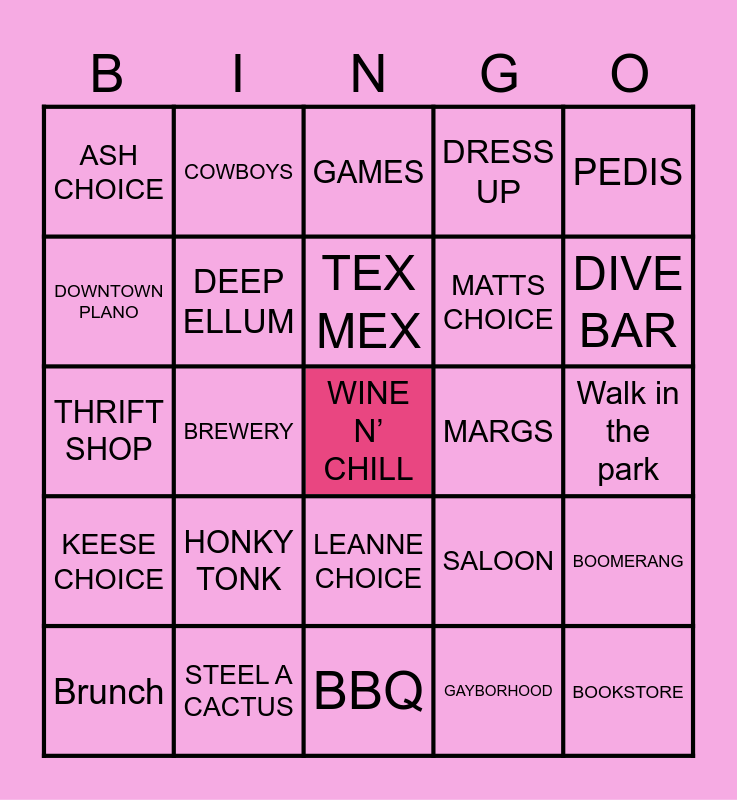 This bingo card has a free space and 24 words: HONKY TONK, STEEL A CACTUS, TEX MEX, Brunch, PEDIS, ASH CHOICE, DOWNTOWN PLANO, COWBOYS, MARGS, LEANNE CHOICE, MATTS CHOICE, THRIFT SHOP, SALOON, BOOMERANG, DEEP ELLUM, GAYBORHOOD, Walk in the park, GAMES, DIVE BAR, BREWERY, BOOKSTORE, KEESE CHOICE, DRESS UP and BBQ.